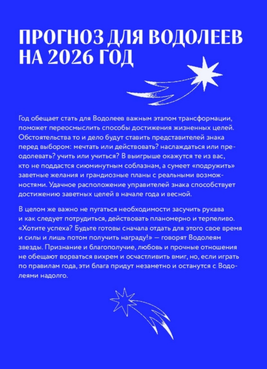 Поздравляю, Водолей! ♒ 2026 год для вас — это год прорыва, дружбы и реализации самых смелых, гуманистических идей. Ваше везение будет приходить через оригинальность мышления, технологическую интуицию и связи с прогрессивным окружением. Это время быть первопроходцем и вдохновителем перемен.