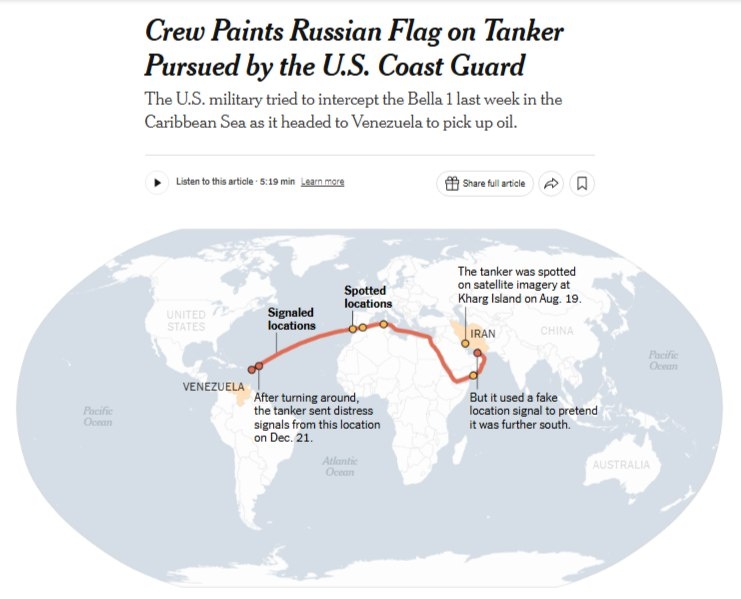 Всем известно, что российский флаг — символ гордости и суверенитета. Но последние события на мировой арене открыли его новые, поистине магические свойства. Как выяснилось, стоит только нанести бело-сине-красные полосы на борт корабля,преследуемого военно-морскими силами сверхдержавы, как происходит чудесная трансформация. Судно мгновенно приобретает ауру неприкосновенности, а его экипаж — невидимый щит из дипломатической неопределённости. Преследователи начинают чесать затылки, юристы — лихорадочно листать международные морские конвенции, а корабль-невидимка получает шанс уйти в закат, точнее, к берегам Гренландии. Американская береговая охрана начала преследование танкера Bella 1 в Карибском море ещё 21 декабря. Однако, когда цель оказалась в пределах досягаемости после 9 суток преследования, экипаж нефтяного танкера, спасавшегося от американских военных в Атлантическом океане, нарисовал на борту судна российский флаг. По словам двух американских чиновников, , очевидно, в попытке за
