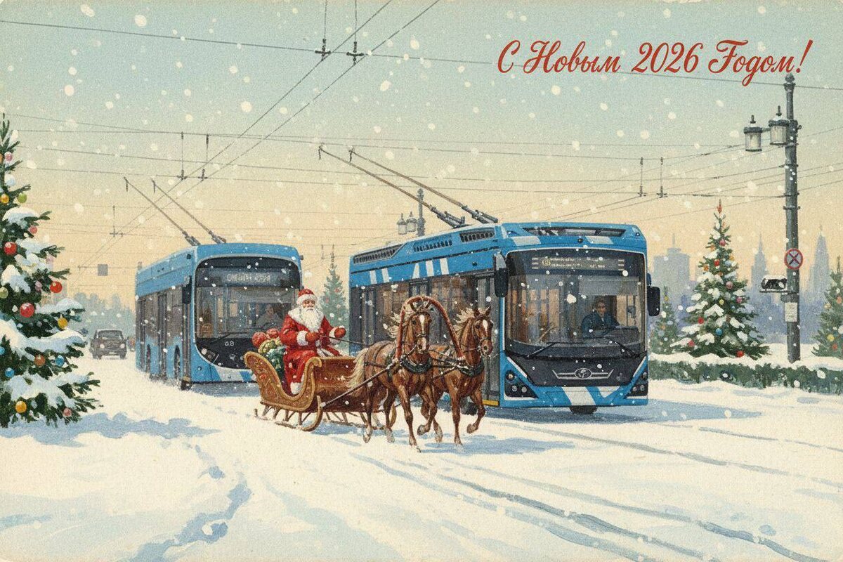 Открытка к новому году с нашим обновленным общественным транспортом.