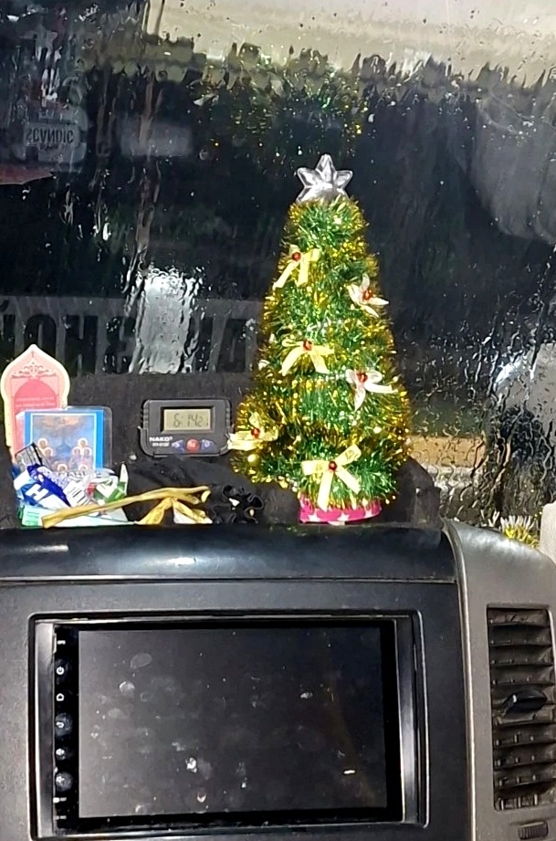 Автобус наряжен соответствующе, а за рулём - Снегурочка. Да))), напарником основного водителя была дама Наташа, уверенно и лихо правящая своим колёсным кораблём))).