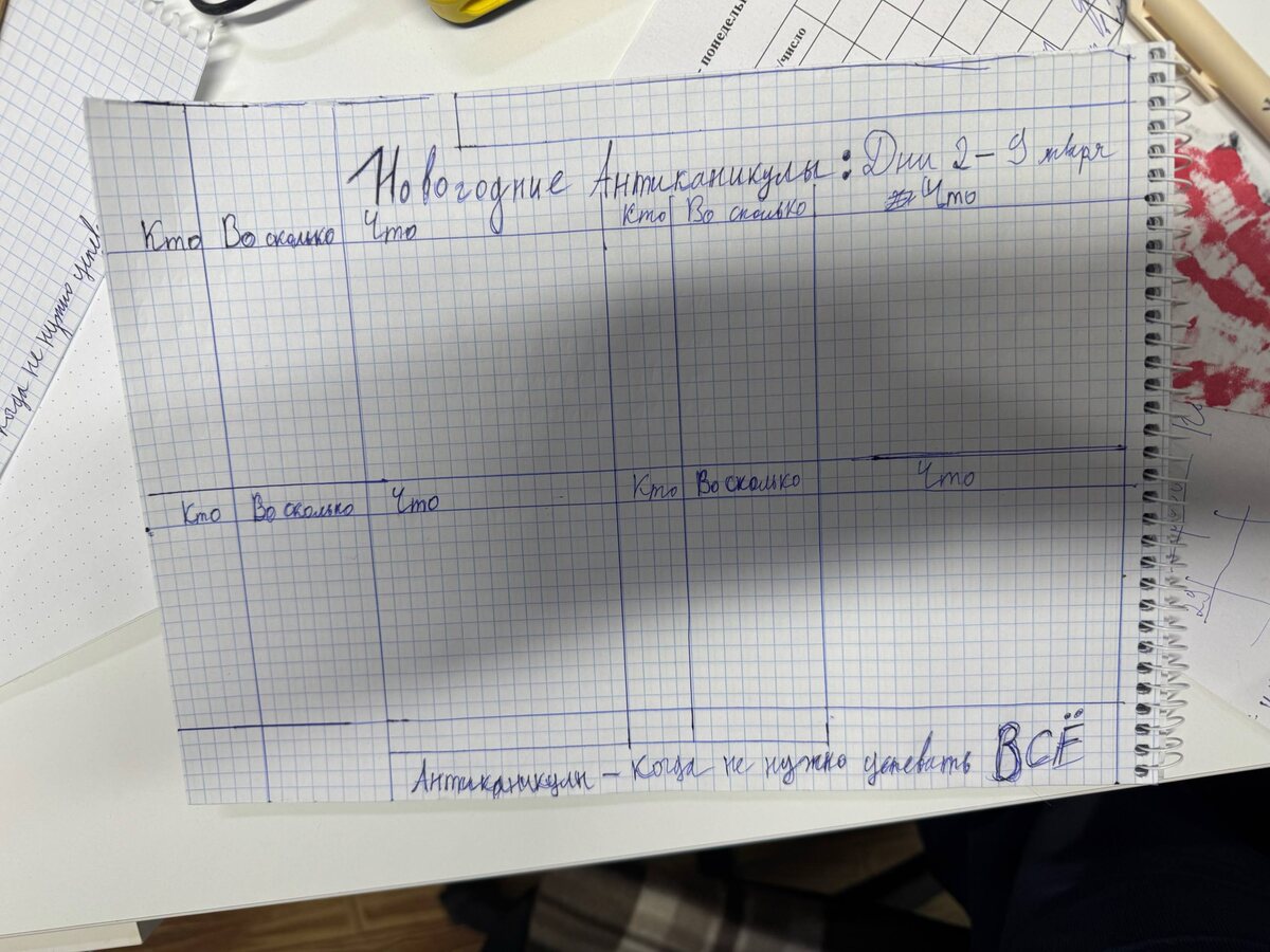Предварительные заметки Часть 2 Иногда лучший лагерь — это не тот, где всё расписано по минутам, а тот, где есть пространство, люди и внимание к состоянию. 📅 Первое общее расписание появится в понедельник. Дальше оно будет уточняться и жить вместе с нами. Как будут проходить наши дни Каждое утро — мягкий вход в день. 🧭 Знакомство и цели на день 🧘 11:00–11:30 — онлайн-практика осознанности 🧘 11:30 — очная практика в пространстве лагеря Чтобы остановиться, собраться и почувствовать опору. На каждый возраст — свои активности 🧒 6–8 лет — 12:00–15:30 Игра, движение, творчество и воображение. 🧑 9–12 лет — 13:00–17:30 Командные игры, мастерские, настолки и совместные проекты. 🧑🎓 Подростки 13+ — 14:00–19:00 и позже Выбор, разговоры, игры, проекты и пространство без давления. 📌 Подростков приглашаем с 6 января. Про баланс и интерес Мы учимся балансу между каникулами и технологиями: — командные игры «как в детстве» — Human: Fall Flat — Minecraft как пространство взаимодей