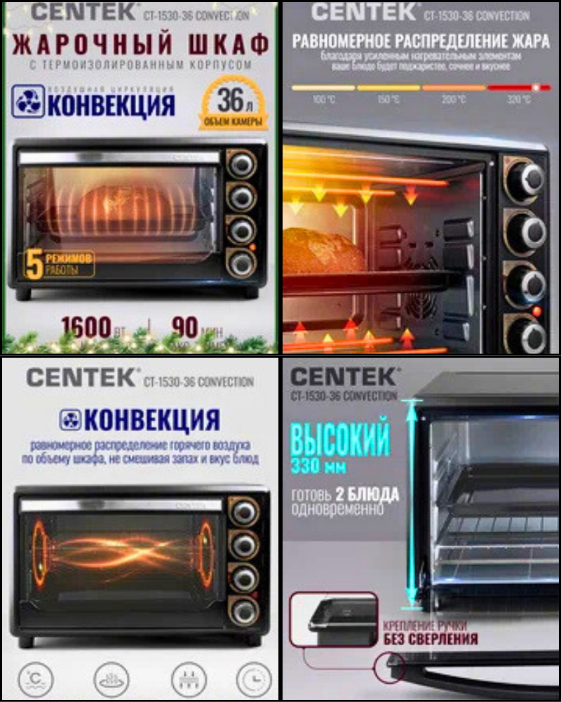 CENTEK CT-1530-36 — это современная и стильная мини-печь (жарочный шкаф) с конвекцией, которая позиционируется как мощный и функциональный помощник для небольшой кухни, дачи или офиса. Она способна заменить собой громоздкий духовой шкаф для большинства повседневных задач. Идеальное применение! CENTEK CT-1530-36 Convection — это отличное сочетание цены, качества и функциональности. Она справляется с 90% задач обычной духовки, при этом занимает минимум места. Ключевая покупка — именно наличие конвекции, которая выводит готовку на новый уровень по сравнению с простыми мини-печами. Рекомендуется, если вам нужна компактная, современная и эффективная духовка для повседневного использования без претензий на профессиональную выпечку.