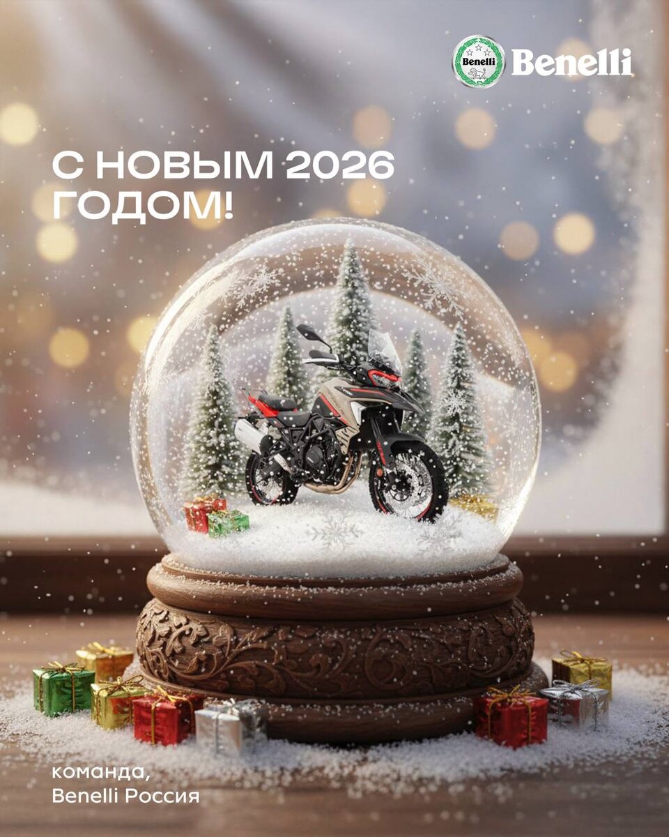 ! С наступающим Новым Годом!🎄 Пусть 2026-й станет для вас годом тёплых встреч, радостных открытий и бескрайних дорог. Желаем вам смелости сворачивать на неизведанные пути, чтобы чувствовать подлинный вкус свободы - а каждый километр на вашем Benelli наполнял жизнь яркими и незабываемыми впечатлениями. Спасибо за все моменты, которые мы разделили в 2025 году. Впереди нас ждут новые встречи и множество захватывающих событий, и мы с нетерпением ждем возможности разделить их с вами! С наилучшими пожеланиями, Команда Benelli Россия