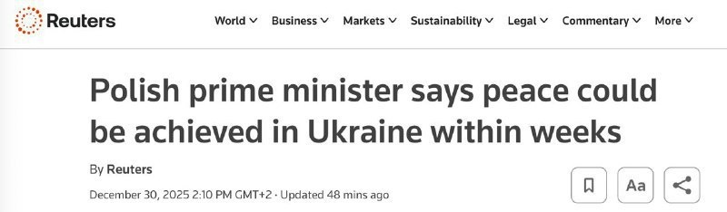 ▪️ Премьер Польши подчеркнул: мир возможен благодаря гарантиям США, но Киев обязан пойти на территориальный компромисс для завершения конфликта. ➖ Туск уточнил Reuters: «Мир на горизонте – это недели, не месяцы. К январю соберемся, чтобы решить будущее Украины и региона». Он назвал это надеждой, но не гарантией. "Ну шо, сынку, помогли тебе твои ляхи?"😂 Подписывайся