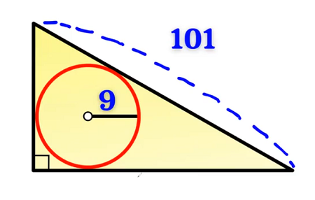 Рассмотрим решение простой геометрической задачи, которая на канале Валерия Казакова решена сложнее, чем надо, с введением двух букв, решением системы, применением теоремы Пифагора. Задача дана под заголовком «Уроки геометрии! Любимый прямоугольный». Итак, задача. 1. В прямоугольный треугольник с гипотенузой 101 вписана окружность радиуса 9. Найдите площадь треугольника. Заключительный кадр решения выглядит так. Источник. Уроки геометрии! Любимый прямоугольный. | Наглядная геометрия | Дзен Задачу можно решить с применением свойства касательных к окружности и формулы площади треугольника (через радиус вписанной окружности). Решение. Проведём три радиуса окружности в точки касания со сторонами треугольника, как показано на рисунке. По свойству касательных к окружности, проведённых из одной точки, AN = AK, BN = BM. Поэтому полупериметр треугольника ABC равен AN + BN + СM = AB + СM = 101 + 9 = 110. Площадь треугольника ABC равна произведению полупериметра треугольника на радиус вписанной о