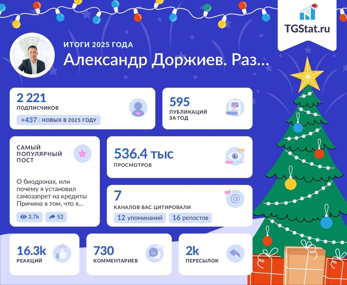 Нас стало более, чем на четыре сотни больше. Полмиллиона с лишним просмотров. Значит, трудился не зря. Удивлён, узнав самый популярный пост. Благодарю за то, что вы со мной, за внимание и доверие! Желаю вам вспомнить все хорошее в уходящем году и поверить, что наступающий 2026-й непременно будет ещё лучше! Главное - будьте счастливы! ❤️ 📱 Александр Доржиев