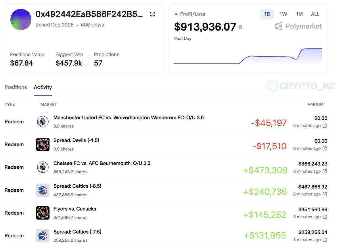 Игрок Polymarket «0x4924» заработал почти $1,000,000 всего за один день – профит по четырем ставкам из шести.