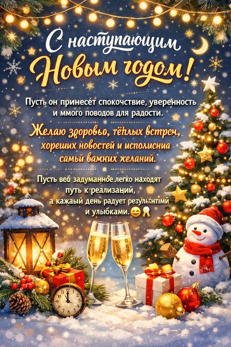 ! 🎄✨ Пусть он принесёт спокойствие, уверенность и много поводов для радости. Желаю здоровья, тёплых встреч, хороших новостей и исполнения самых важных желаний. Пусть всё задуманное легко находит путь к реализации, а каждый день радует результатами и улыбками 😊🥂