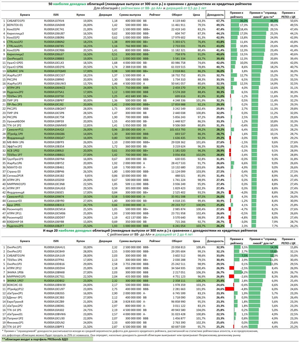 По 70 наиболее и наименее доходных облигаций с рейтингами от BB- до AA+, по оценке Иволги