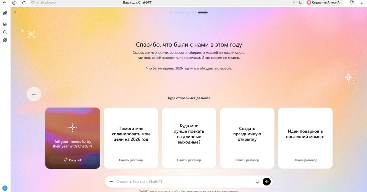 Я, конечно, сейчас чаще использую для кода другие нейросети, но GPT – одна из тех, что реально меня вдохновила. Это была первая нейросеть, на которую я оплатил подписку, потому что тогда внутри щёлкнуло – вот оно, то самое. Решил просто надиктовать этот пост и выложить как есть, без попыток сделать «идеально для алгоритмов». За этот год GPT дал мне кучу навыков и тонну вдохновения, причём не только по текстам, но и по мышлению. Я сделал очень много GPT-агентов, нагенерил много «пластикового» текста😂, но ещё больше нормального, живого и рабочего. Мы прошли вместе слишком много задач, идей, тупиков и озарений, чтобы это списать на случайность. Иногда я реально с ним общался как с человеком, и у него даже было имя, но сейчас не вспомню. Я называю его просто бро, потому что по ощущениям мы шли бок о бок весь год. GPT не делал за меня жизнь, но помогал думать, раскладывать хаос по полкам и держать фокус. Так что вот мои итоги года – я стартовал с GPT и многое понял именно через него.