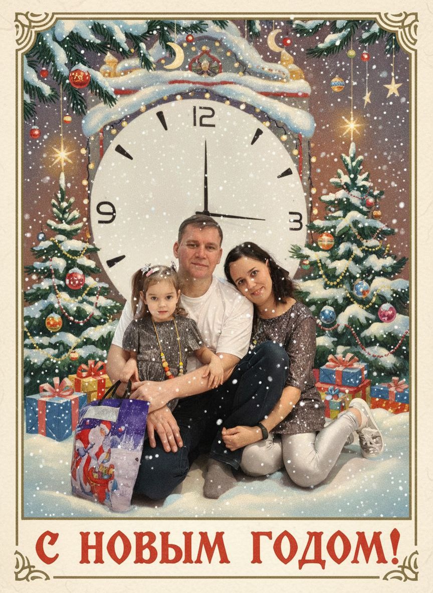 ! Делюсь:❤️ Как сделать новогоднюю открытку? ✅ Заходим в бота @GPT4Telegrambot ✅ Выбираем «Меню» ➡️ создать изображение ✅ Нажимаем Nano Banana ✅ Отправляем фото и этот промт👇🏼 Создай винтажную новогоднюю открытку на основе загруженной фотографии. Стиль - советские сказочные открытки 1970 годов. Со снегом, елкой, подарками. Лица не меняй, Оставь как на моей фотографии , мимику . Не меняй черты лица, возраст и эмоции. Формат квадратный. Делитесь , что получилось ? 🥹😂😊с наступающим!!!!⭐️🚩❄️🍪🏡