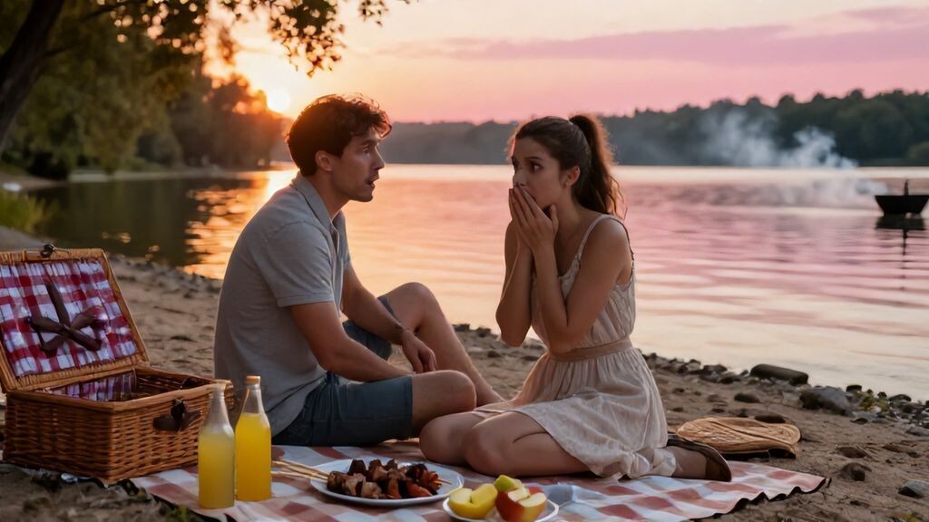 Летний вечер на берегу озера дышал теплом, пропитанным ароматом свежескошенной травы и дыма от мангала. Солнце клонилось к горизонту, окрашивая воду в золотисто-розовые тона, а воздух вибрировал от стрекота цикад и отдаленного смеха детей, бегающих по песчаному пляжу. Алексей разложил плед на неровной земле, усыпанной мелкими камешками, и аккуратно расставил корзину с бутербродами, бутылку домашнего лимонада и миску с нарезанными яблоками. Рядом сидела Маша, его девушка уже полгода, в легком сарафане цвета спелой вишни, который колыхался от легкого ветерка. Ее волосы, собранные в небрежный пучок, выбивались прядями, щекоча шею, а на губах играла улыбка, когда она протягивала ему бутылку.