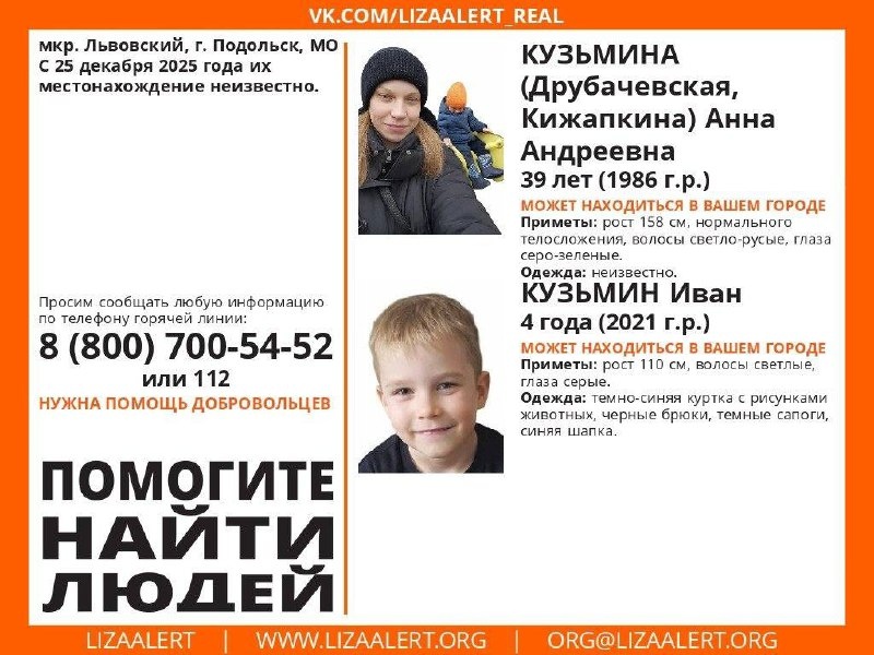 ❗️ 🛑 Кузьмина Анна Андреевна, 39 лет, и Кузьмин Иван, 4 года, мкр. Львовский, Подольск, МО. 🛑 С 25 декабря 2025 года их местонахождение неизвестно. Контакты для свидетельств: 📞 Инфорги: Екатерина Юта 8(985)068-68-63, Дарья Луми 8(980)724-74-97. 📞 Гор. линия ПСО "ЛизаАлерт": 8(800)700-54-52 (круглосуточно).