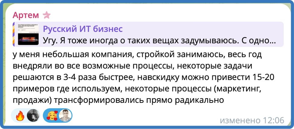 ИИ в стройке. Приятно такое читать. Скажу честно, мы слабо ИИ используем, хоть и в ИТ работаем. Ну договора проверяем, досудебки пишем, рерайт... Да и все. Правда программисты очень активно сидят в ИИ, особенно фронт. Русский ИТ бизнес
