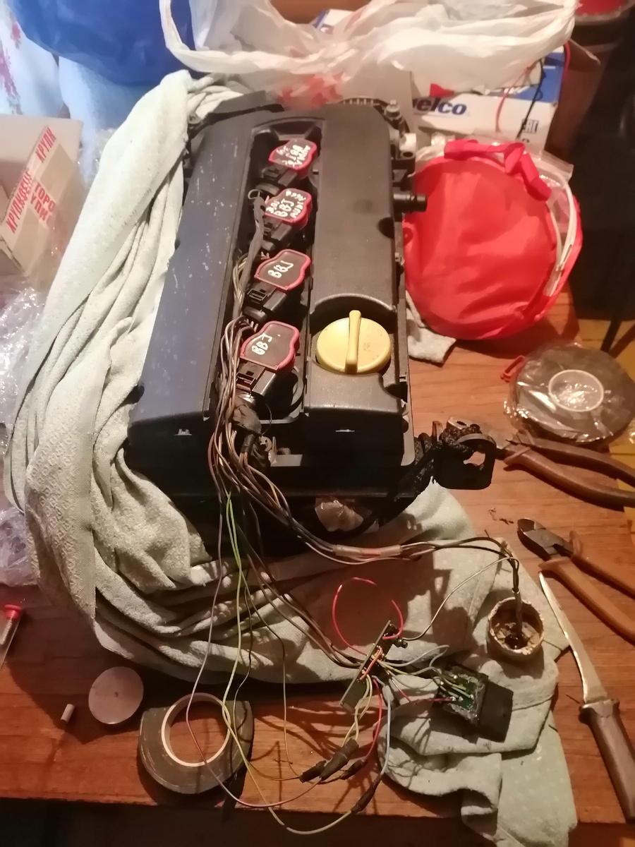 Пока ничего изобретать не стал. Готовый кусок проводки от какого-то ВАГа, бу катушки, купил ранее на авито. Уже больше года валяются в гарвже. Хвосты подрезал, немного причесал. По длине ничего не подгонялось. На монтажной платке на коленке собран переходник. Разъем пока взят от развороченной в щепки старой