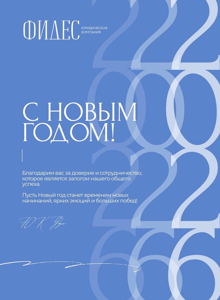 ! В новом году желаем вам смелых решений и больших побед, надёжных партнёров и выгодных сделок, роста без кризисов и уверенности в каждом шаге. Пусть закон всегда будет на вашей стороне, а ваш бизнес растёт и крепнет с каждым годом. Счастья, здоровья и новых достижений в 2026 году! С уважением и наилучшими пожеланиями, Команда ЮК Фидес 🎄✨