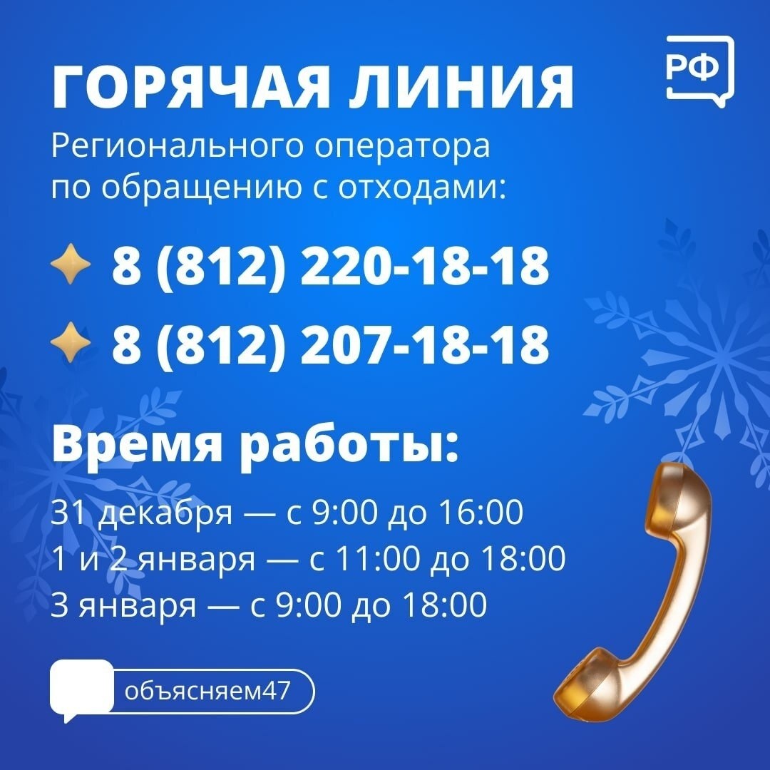 Региональный оператор принял меры для обеспечения бесперебойного вывоза твердых коммунальных отходов в зимний период и во время новогодних праздников. Увеличено количество специализированной техники и привлечены дополнительные подрядчики. Собственники контейнерных площадок обязаны следить за их состоянием и доступностью. В праздничные дни также будет работать горячая линия для обращения по вопросам вывоза мусора. Номера телефонов и время работы указаны в карточке. Также автомобилистов просят быть внимательными и парковать машины так, чтобы они не стали препятствием для работы спецтехники. Транспортные средства могут стать помехой для работы коммунальных служб, а также для вывоза мусора. Пресс-служба Заневки 🌇 Жизнь в Кудрово ( ВК | Max ) Есть новости? Пишите сюда.