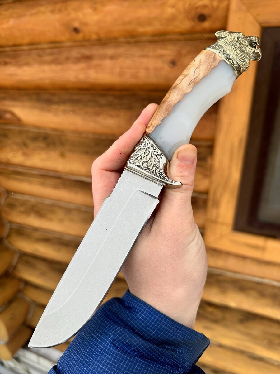 ! Ищете увесистый и надёжный нож? Представляем новинку из стали К340 — этот материал знаменит своей устойчивостью к излому и длительным сохранением остроты. Твердость клинка — 64 HRC: уверенно справляется с самыми сложными задачами на охоте, рыбалке или в походе. 🔸 Рукоять — уникальное сочетание мельхиора (*техническое серебро*) и гибрида стабилизированной карельской берёзы янтарь с белым акрилом: не только удобно лежит в руке, но и украшает коллекцию любого ценителя. В комплекте — ножны из натуральной кожи. Для тех, кто ценит индивидуальность и максимальную защиту, можем изготовить формованные ножны (+8000 ₽). Цена без скидки: ~16 668 ₽~ Ваша цена со скидкой: 13 890 ₽ 📲 Заказывайте в один клик: • Telegram: [@Nazarklinokbot](https://t.me/Nazarklinokbot) • WhatsApp/Viber: [ +7 910 134-38-31](https://wa.me/79101343831) #ножик340 #кузницаназарова #ручнаяработа #кожаныеножны #карельскаябереза #охотничийнож #подарокмужчине