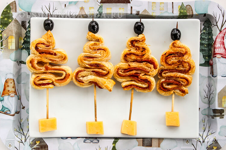 Такие мини-пирожки готовятся очень просто, они хрустящие и очень вкусные. Понравятся и детям, и взрослым. Готовятся закусочные «елочки» из слоеного теста (бездрожжевого). Между двумя пластами теста нужно выложить начинку из сливочного сыра и тонко нарезанной колбасы, ветчины или балыка. Тесто нарезать полосками и сложить в виде гармошки. Зафиксировать конструкцию с помощью бамбуковых шпажек. А чтобы слойки были более похожи на символ Нового года, верхушку можно украсить оливкой, маслиной или звездочкой, вырезанной из сыра. Общее время: 2 часа | Время приготовления: 40 минут