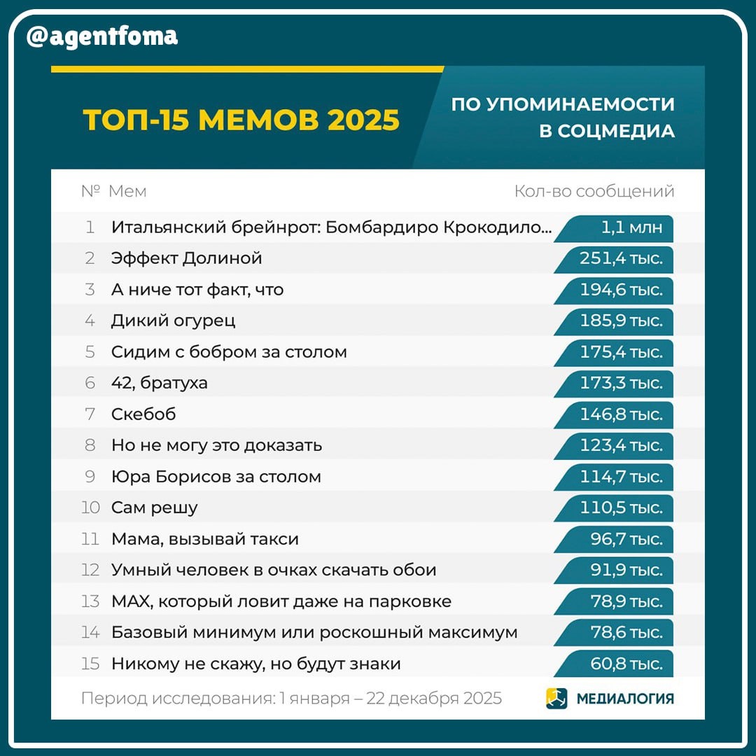 π Π’ΡΠ°Π΄ΠΈΡΠΈΠΎΠ½Π½ΠΎΠ΅ ΠΈΡΡΠ»Π΅Π΄ΠΎΠ²Π°Π½ΠΈΠ΅ Π°Π½Π°Π»ΠΈΡΠΈΠΊΠΎΠ² Β«ΠΠ΅Π΄ΠΈΠ°Π»ΠΎΠ³ΠΈΠΈΒ» ΠΏΠΎ ΠΎΠΏΡΠ΅Π΄Π΅Π»Π΅Π½ΠΈΡ ΡΠ°ΠΌΡΡ ΠΏΠΎΠΏΡΠ»ΡΡΠ½ΡΡ ΠΌΠ΅ΠΌΠΎΠ² ΠΎΡ Π²Π°ΡΠΈΠ»ΠΎ ΠΏΠ΅ΡΠΈΠΎΠ΄ Ρ ΡΠ½Π²Π°ΡΡ ΠΏΠΎ Π΄Π΅ΠΊΠ°Π±ΡΡ 2025 Π³ΠΎΠ΄Π°