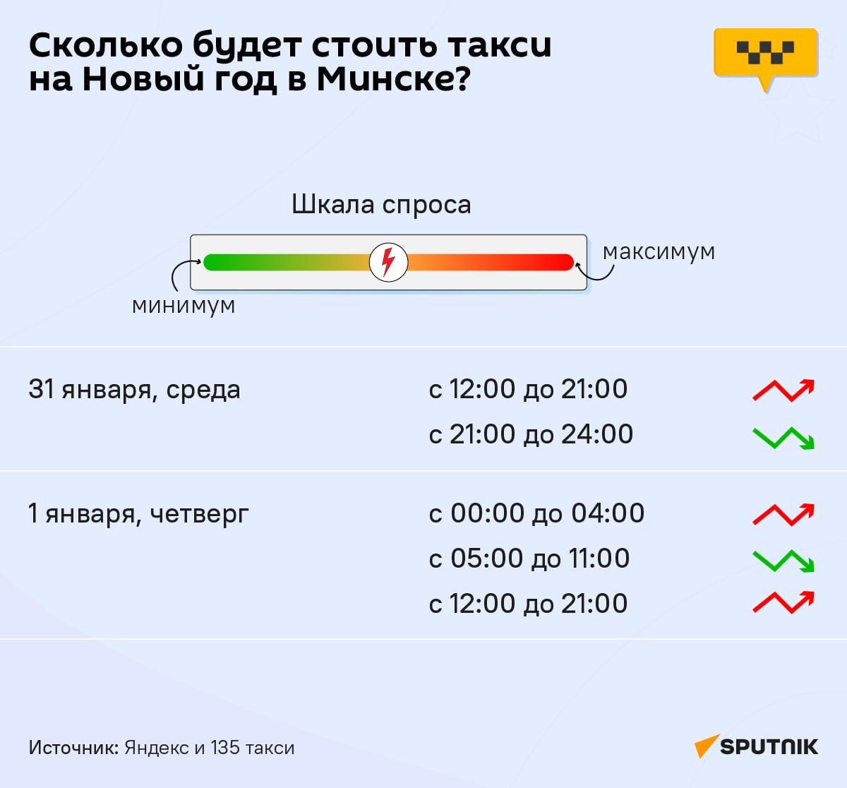Сейчас — еще не пик: сколько будет стоить такси в новогоднюю ночь в Минске До Нового года остается меньше 9 часов, а цены на такси в Минске уже неприятно удивляют. Однако столичные сервисы ожидают, что ночью станет еще дороже. Один из водителей, работающих с "Яндексом", рассказал @SPUTNIKBY, что с 01:00 до 03:00 1 января тариф будет максимальным, проехать несколько километров будет стоить от 30 рублей. Вторая волна ажиотажа придется на время с 05:00 до 08:00 утра 1 января. Также минчанам и гостям столицы следует быть готовым к тому, что вечером 1 января будет опять повышенный коэффициент. Подробнее — в нашей инфографике. 🔴 Читайте Sputnik Беларусь в MAX