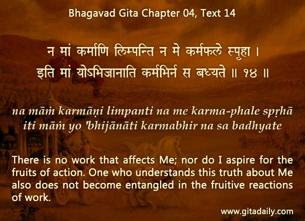 «Действия не оскверняют Меня. У Меня нет стремления к плодам действий. Тот, кто постигает эту истину обо Мне, не оказывается в плену кармы».