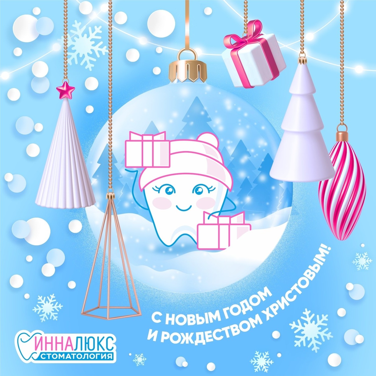 ! Поздравляем вас с Новым годом и Рождеством Христовым! 🎄 Пусть Новый год начнётся с тёплых встреч, радостных моментов и счастливых улыбок! От всей души хотим пожелать вам благополучия, крепкого здоровья и исполнение самых заветных желаний. 💫 Спасибо, что выбираете нас и доверяете самое ценное — заботу о своём здоровье и здоровье близких. ❤ Для нашей команды это не просто работа — это ответственность и искреннее желание помочь каждому пациенту чувствовать себя спокойно и уверенно. Мы будем рядом и в Новом году — с ещё большим вниманием, заботой и профессиональным подходом к каждому пациенту. 💙 С наилучшими пожеланиями, коллектив стоматологии «ИННАЛЮКС».