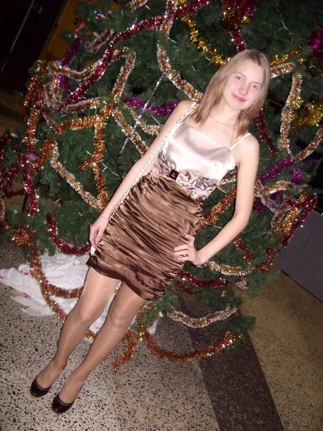В мерцающем свете новогодних гирлянд, словно героиня волшебной сказки, стоит молодая девушка. Её образ — воплощение лёгкости и праздничного настроения. Короткое платье оливкового оттенка, будто сотканное из закатного света, изящно облегает фигуру, подчёркивая её стройность. Лёгкие складки и драпировка на талии придают наряду нотку изысканности, а короткие рукава с мягкими «крылышками» добавляют игривости.