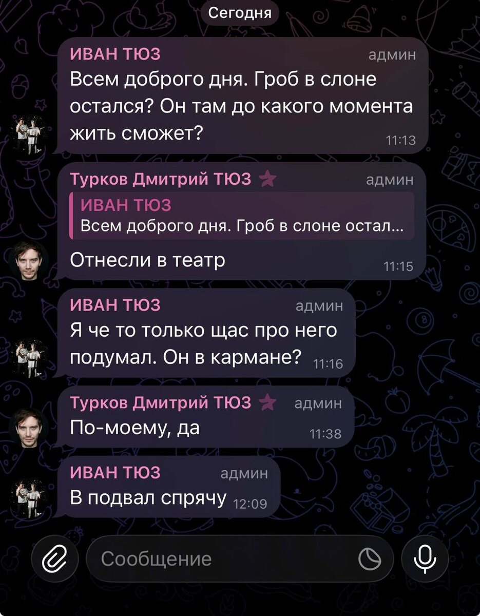?> Знаете, какая наша любимая часть работы? Когда магия спектакля уже случилась, а жизнь продолжает писать для нас самый невероятный абсурдный театральный текст. Решили поделиться с вами свежей перепиской из нашего рабочего чата. Без контекста - просто наслаждайтесь. Возможно, только в театре диалоги про «гроб в слоне» кажутся делом обычным 😄 А если серьёзно, именно такие моменты - когда смешивается невероятное, срочное, творческое и смешное - и составляют ткань нашей театральной жизни. И мы бесконечно любим эту жизнь и вас, наши зрители! Пусть в наступающем году у каждого из вас будет своя «сцена», на которой случается чудо. Пусть в вашей «пьесе» будет много смеха, вдохновения и счастливых развязок. Пусть вас окружают такие же надёжные и готовые к любым «слонам» партнёры, как в нашей команде. С Новым годом! Пусть 2026-й будет ярким, как софиты, и тёплым, как аплодисменты!