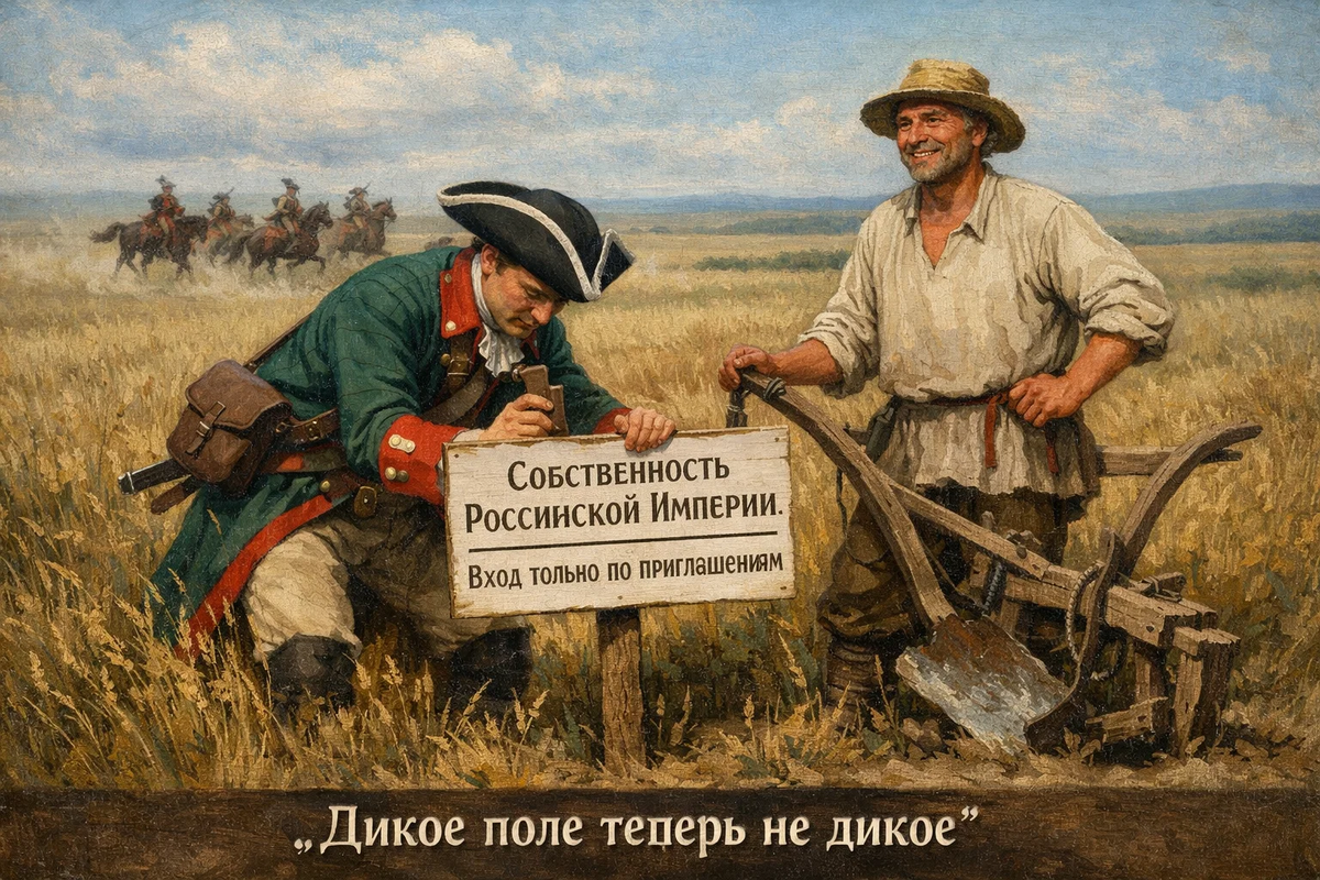 Представь себе огромную пустую степь (как в "Безумном Максе", только с травой). Это было Дикое поле к югу от России. Если Екатерина была "мозгом", то Григорий Потёмкин — "руками" (и тайным мужем 😉).