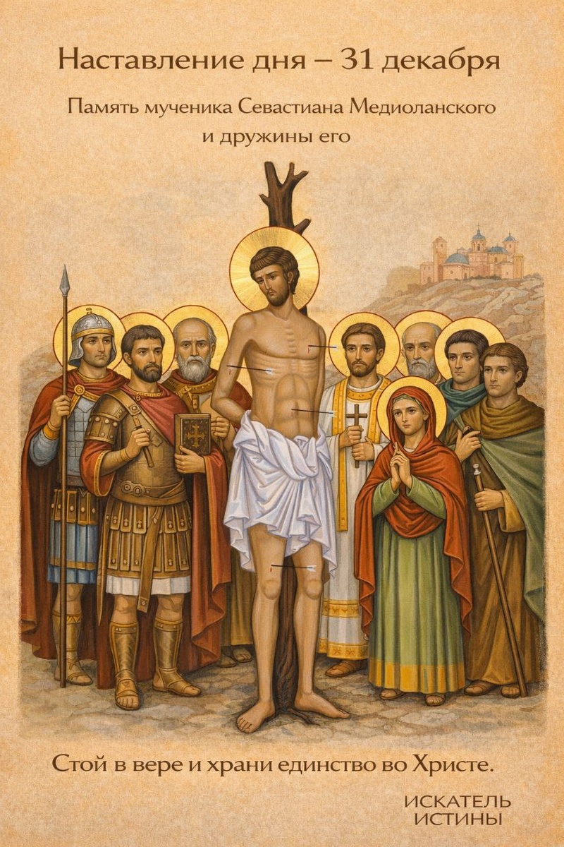 Память мученика Севастиана Медиоланского и дружины его Святой мученик Севастиан и святые, пострадавшие вместе с ним — Никострат, мученица Зоя, мученик Касторий, священномученики Транквиллин, пресвитер, Маркеллин и Марк, диаконы, мученики Клавдий, Симфориан, Викторин, Тивуртий и Кастул — явили редкий пример братской верности и мужества во Христе. Они поддерживали друг друга в испытаниях, укреплялись общей молитвой и не отступили от веры даже перед лицом смерти. Их подвиг напоминает нам: там, где есть единство во Христе, страх теряет свою силу. Пусть и твой день, завершающий год, будет наполнен благодарностью Богу, верностью истине и надеждой, которая не постыжает.