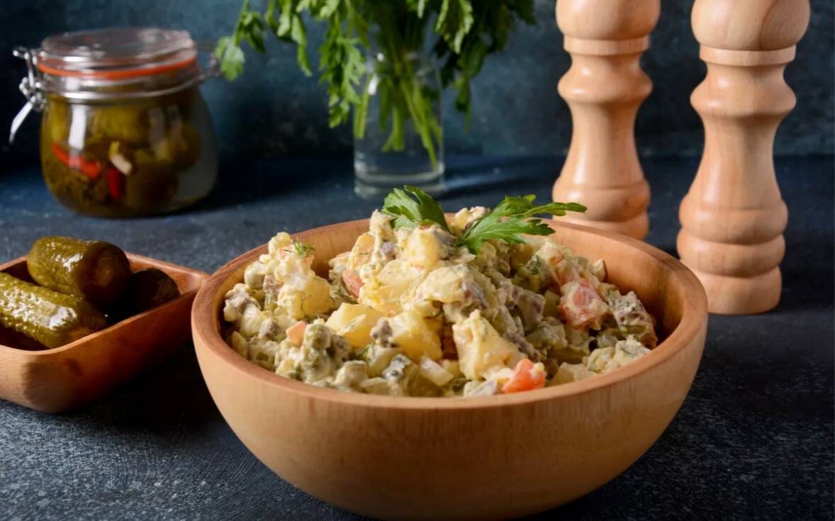 и раковыми шейками. Мы приводим 3 самых известных у нас. И, кстати, во Франции и Италии наш салат называют русским 😉 С колбасой Ингредиенты: картофель — 4–5 шт.; морковь — 2 шт.; яйца — 4 шт.; варёная колбаса — 300 г; солёные огурцы — 3–4 шт.; консервированный зелёный горошек — 1 банка; майонез — 150–200 г; соль, перец — по вкусу. С курицей Ингредиенты: куриное филе — 300 г; картофель — 4 шт.; морковь — 2 шт.; горошек консервированный — 200 г; огурцы маринованные — 3–4 шт.; яйца куриные — 4 шт.; майонез — 150 г; соль, чёрный перец — по вкусу. С говядиной Ингредиенты: горчица — 10 г; куриное яйцо — 3 шт.; соль, молотый чёрный перец — по вкусу; петрушка — 10 г; картофель — 300 г; майонез — 150 г; морковь — 200 г; лук — 50 г; варёная говядина — 300 г; горошек зелёный консервированный — 200 г; огурцы — 200 г. А вы какой предпочитаете?