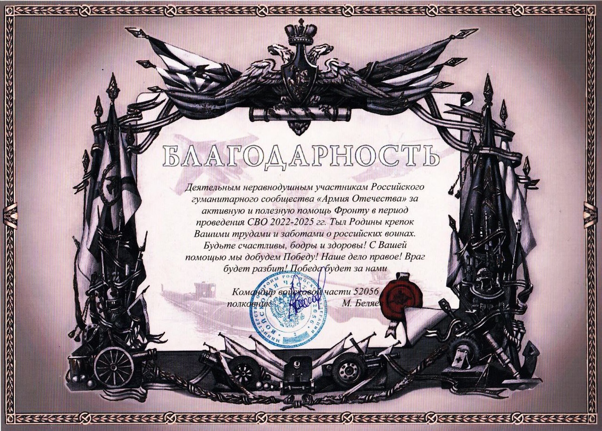 ! Представляю благодарности участникам нашего сообщества "Армия Отечества" от командования 60 самоходного артполка 69 гв. мсд (Белгородская обл.) и сводной роты в/ч 69359 (Брянская обл.), которым нам удалось неоднократно помочь в 2025 г. Наше дело правое! Победа будет за нами!