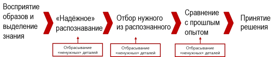 Смысл мышления, в широком смысле, и смысл принятия решения, в узком смысле, - более эффективное действие в конкретной ситуации. Людям кажется, что «эффективность» - это упрощение, отбрасывание деталей: меньше деталей -> иллюзия понимания (знания) сложности -> настоящие сложности по ходу действия и трудности по исправлению ситуации. В ходе каждого этапа мышления, предшествующего принятию решения, происходит отбрасывание «ненужных деталей. Это (1) подпитывает нашу иллюзию знания и (2) объективно сокращает сложность и потенциальную верность принимаемого решения. На картинке - путь к иллюзии знаний и неверным решениям.
