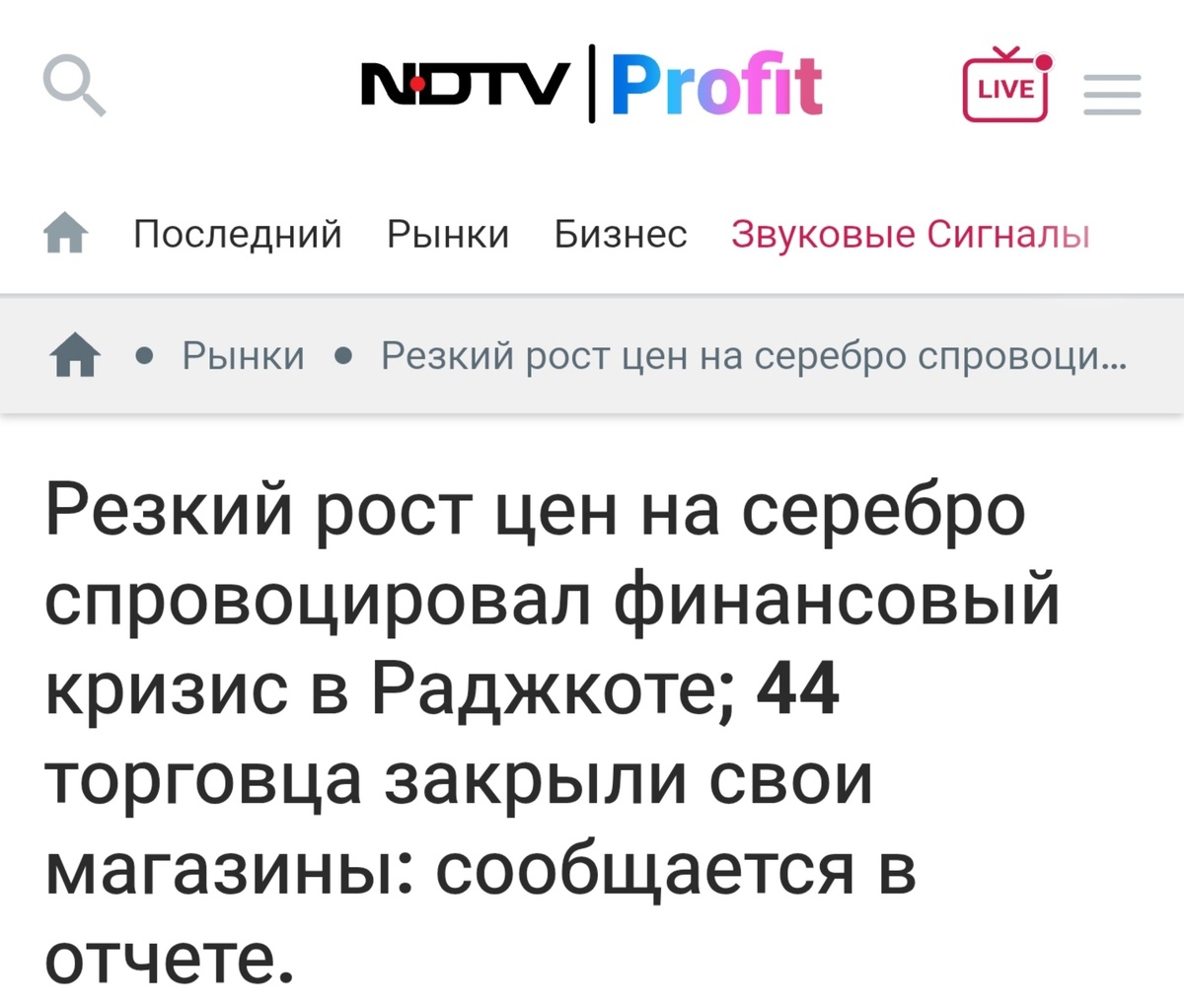 Серебро не более, чем GameStop 2.0 А пик лудомании, вероятно, уже пройден. Всех с санта-сралли, поедем существенно ниже: В статье, опубликованной в местной газете Gujarat Mirror , издающейся в Раджкоте, утверждается, что резкий рост цен на серебро во всем мире спровоцировал кризис: до 44 торговцев в городе объявили о банкротстве В отчете говорится, что эти фирмы были вынуждены объявить о банкротстве после того, как не смогли погасить задолженность https://www.ndtvprofit.com/markets/silver-price-surge-triggers-financial-crisis-in-rajkot-44-firms-insolvent-report @marketheart