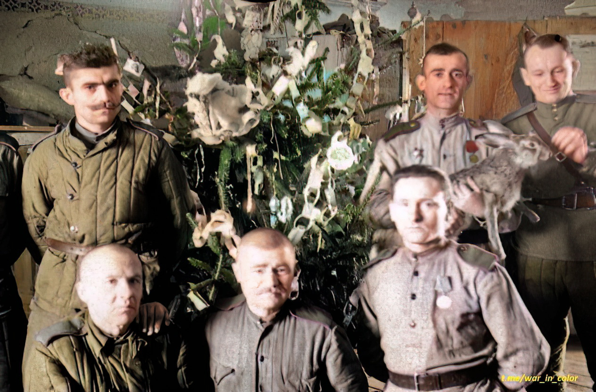Бойцы и командиры 118-го укрепленного района встречают Новый год у елки, украшенной бумажными гирляндами и ватой. Согласно воспоминаний автора фото — Валерия Федоровича Булычева (в период Сталинградской битвы — кино-радиотехника политотдела, с июля 1943 года — заведующего делопроизводством пулеметно-артиллерийского батальона), так отмечали Новый 1943-й год в только что освобожденном Сталинграде, это был подвал какой-то школы, где и установили елку, а чучело зайца, которое держит в руках один из военнослужащих было, найдено тут же в подвале среди наглядных пособий и стало настоящим талисманом части, с которой «дошло» до Победы.
