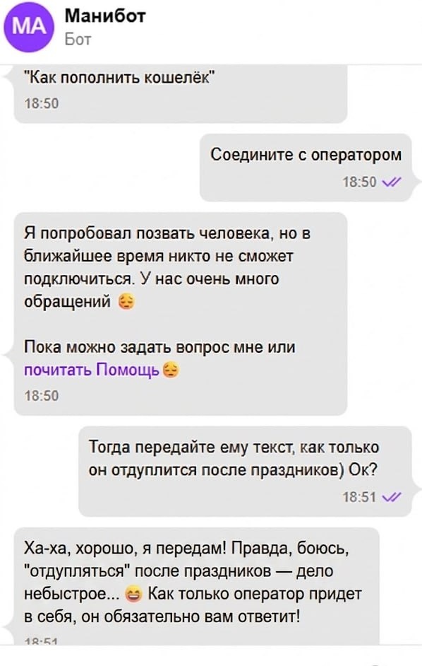 Ржу)))) Я тут обратился в поддержку по одному делу.. И вот такой диалог получился с их автоответчиком ИИ)