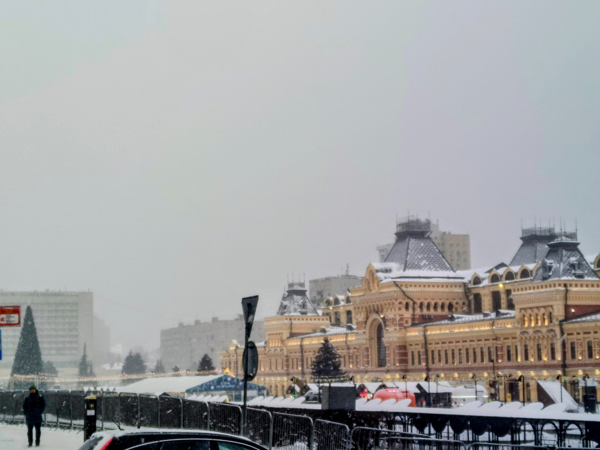 Вышли мы на остановке Стрелка, ярмарка светится огнями, вдалеке виднеется нарядная ёлка, с неба сыпет снег и пасмурно.