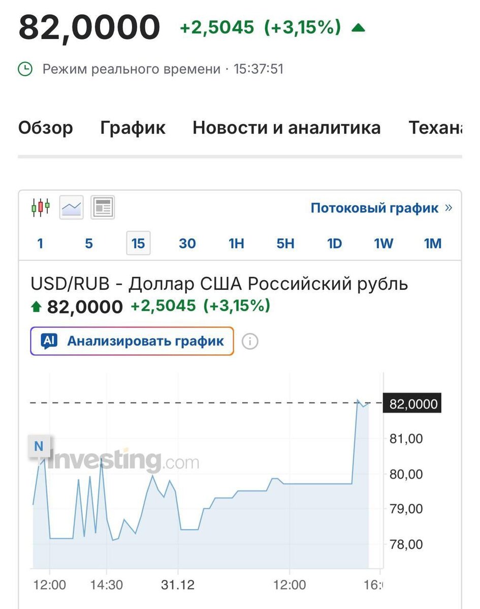 📈 Доллар преисполнился праздничного настроения и взлетел до 82 рублей.