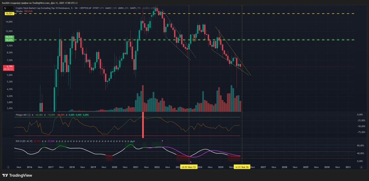#OTHERS.D 1M. На месячных свечах наблюдается формирование бычьей дивергенции. Скользящие средние на нижнем индикаторе идут к пересечению. В предыдущий раз на этом пересечении было ралли.