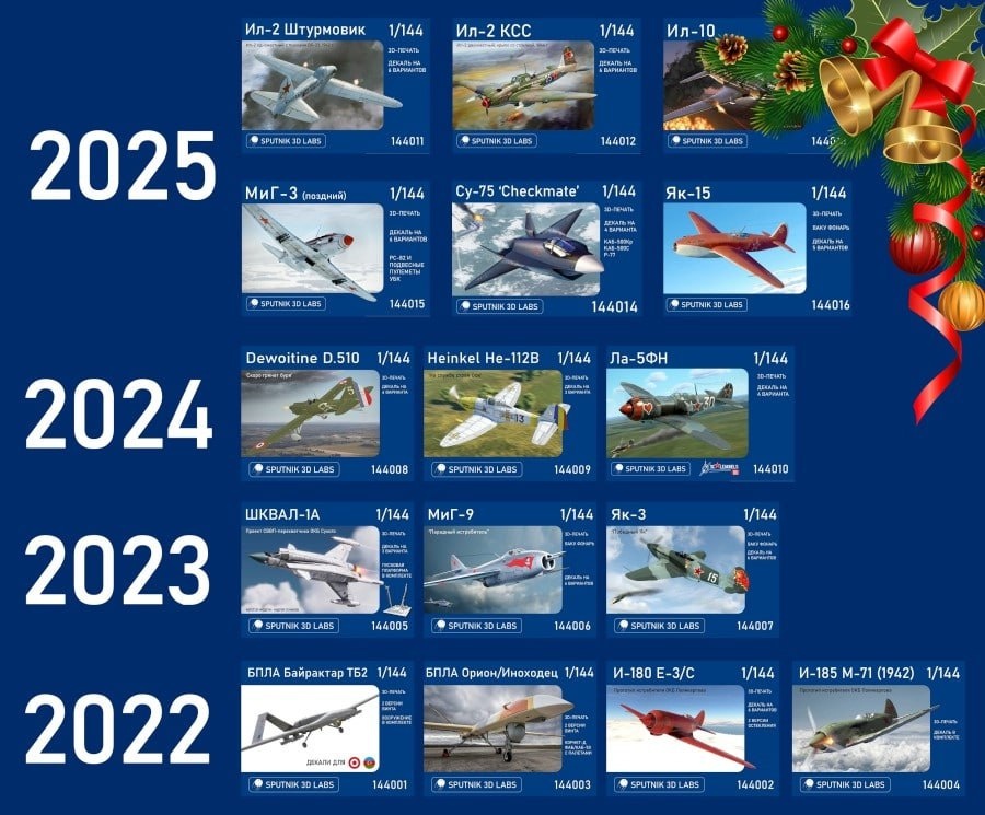 : В последний день уходящего года принято подводить итоги. С точки зрения количества релизов 2025 год побил все рекорды - целых 6 новых моделей от нашего скромного кооператива! Да, основная часть работы по Илам была сделана в 2024, но тем не менее... И даже многострадальный Як-15 увидел свет! На следующий год планов не меньше - уже анонсированы ЛаГГ-3 и Ла-9, где 9й там и 11й рядом, плюс еще один аппарат КБ Яковлева. При этом даже самые первые модели никуда из продажи не пропали и все так же доступны в магазине группы. Как говорится, есть у 3D-печати свои приемущества... Партия Су-34х нашлась и едет по России, и очень надеюсь что Дедушка Мороз скоро положит ее под новогоднюю елку. В Новом Году желаю всем читателям больше моделей, хороших и разных, но главное - здоровья вам и вашим близким! Остальное приложится🎄🥂
