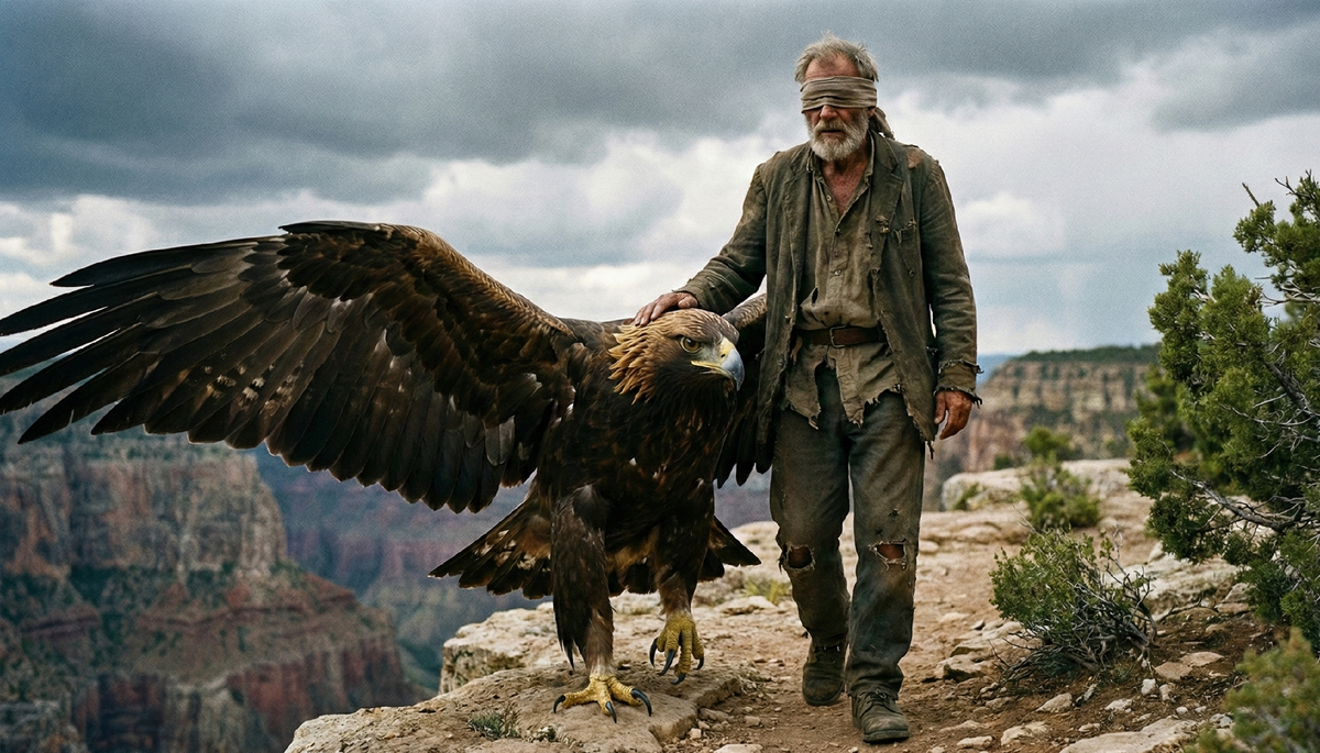 Когда старик выходил за водой к горному ручью, беркут неизменно сидел на его плече или парил чуть впереди, издавая звуки-маяки. Если впереди был обрыв, трещина или неустойчивый камень, птица издавала короткий, резкий, гортанный клекот. Захар замирал и тщательно прощупывал путь посохом.