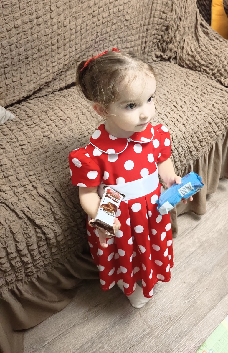 Вот так и платье, в котором в центре на утреннике были, тоже, наверно, непонятным Амелии показалось. У него очень пышная и довольно "хрустящая" юбочка, смотрится, конечно, красиво и выглядит надёжно. Но, когда Меля дома попыталась сесть в нём на стульчик, она как-то неуверенно села, может, боялась непривычных ощущений?