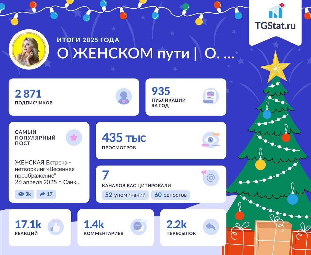 🤍 Женская Душа похожа на Океан💫 Он не возникает внезапно. Он собирается из тысяч состояний, мыслей, выборов, слов и маленьких честных шагов к себе. Каждый день - это как капля. И только оглядываясь назад, начинаешь видеть масштаб волны. Я подвела итоги 2025 года в этом канале и внутри возникло теплое ощущение благодарности и радости. В течение года мы живём, чувствуем, ищем, сомневаемся, растём и часто даже не замечаем, сколько на самом деле уже прожито и пройдено. А итоги вдруг показывают нам, что путь был большим, объемным, ярким, наполненным. И вот смотря на прошедший год, оглядываясь назад, я вижу что сделано очень много👇 За 2025 год в канале: ✨ 2 871 женщина стала уже не просто подписчицей, а живой участницей общего поля ✨ 935 публикаций мыслей, смыслов, состояний, которые рождались не «по плану», а из жизненного опыта ✨ 435 000 просмотров - это ваше внимание, присутствие и отклик ✨ 17 100 реакций, как знак того, что слова находили в ваших сердцах свое место ✨ 1 400 комм