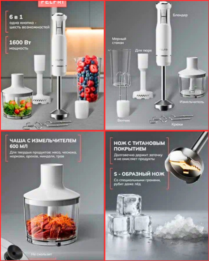 Блендер FELFRI — это мощная и функциональная модель для кухни. Погружной блендер FELFRI (1600 Вт) позиционируется как универсальный инструмент для быстрого и эффективного приготовления разнообразных блюд. Его ключевые преимущества — высокая мощность, комплектация насадками и информативный LED-дисплей. Он подходит для тех, кто хочет за один прием получить полноценный кухонный комбайн начального уровня. Высокая мощность (1600 Вт): Главный козырь модели. Такая мощность легко справляется с: