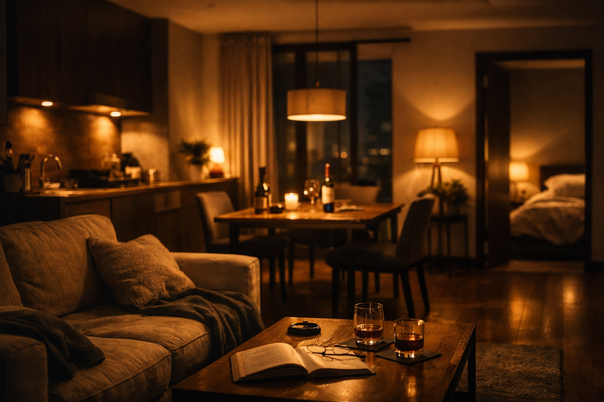 Вечером свет вроде тёплый, не режет глаза, но расслабления нет.
