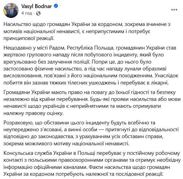 Об этом сообщил посол Украины в Польше Василий Боднар. По его информации, избиение носило характер преступления на почве национальной ненависти. Согласно заявлению посла, сначала между мужчиной и другими лицами возник бытовой конфликт, позже на украинца напала группа людей. Пострадавший получил тяжелые телесные повреждения и был госпитализирован. В настоящее время он находится в больнице. Сайт "Другая Украина" / Telegram / Вконтакте / Центр поддержки Украинцев / Жалоба на ТЦК 🇷🇺"Другая Украина" теперь в МАХ