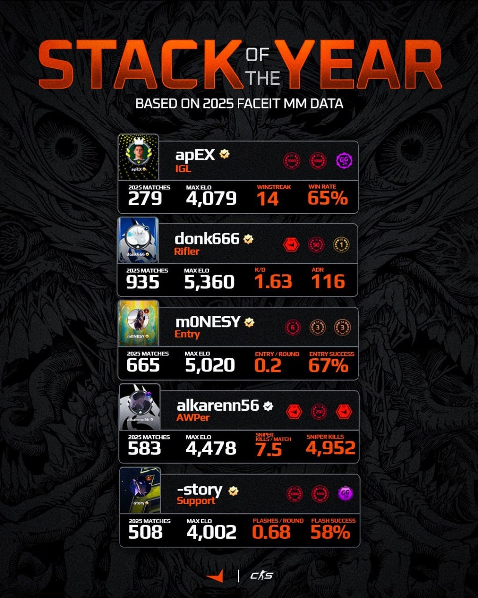 : Представляем вам «Лучший состав игроков года по версии FACEIT 2025», который определяется по ролям на основе внутренних данных FACEIT о результатах матчей 2025 года и мнений игроков из топ-1000 рейтинга Elo. Цель — создать самый сложный для победы состав. Только матчи FACEIT. Официальные матчи исключены Как вам команда?