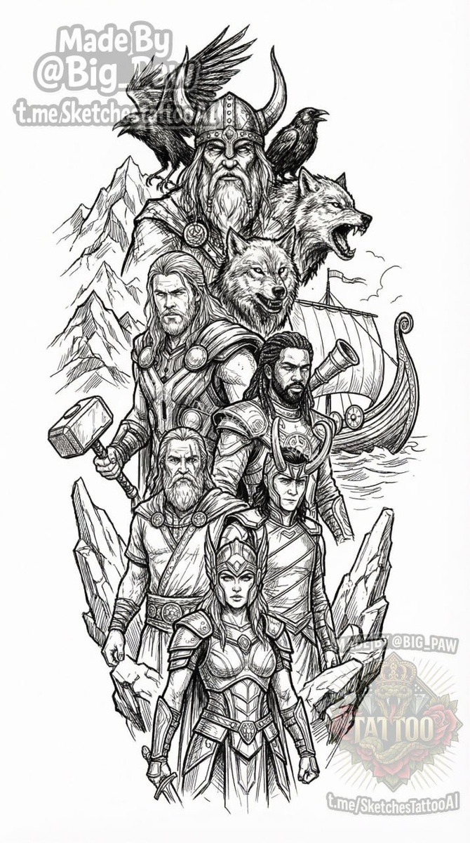 добавить асов, Тора, Хеймдалля, Локи, валькирий, Тюра. На рукав. Да и вместо арок греческих на заднем фоне горы или камни или может драккар, в такомиже стиле 🧠 SYNTX - тут создан эскиз 💎 Информация - все услуги 💀 Эскизы от нейросети 😎 Удалить тату #один #боги #скандинавская #эскиз #тату #татуировка