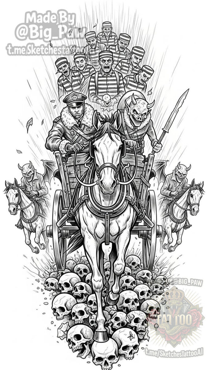 тулупе черт в общем копыта нос свинной дорога вся черепами усыпана такие же конвоиры черти на конях дохлых и взади вереница зеков в полосатой робе тощих замученых. 🧠 SYNTX - тут создан эскиз 💎 Информация - все услуги 💀 Эскизы от нейросети 😎 Удалить тату #тюремная #скетч #реализм #эскиз #тату #татуировка